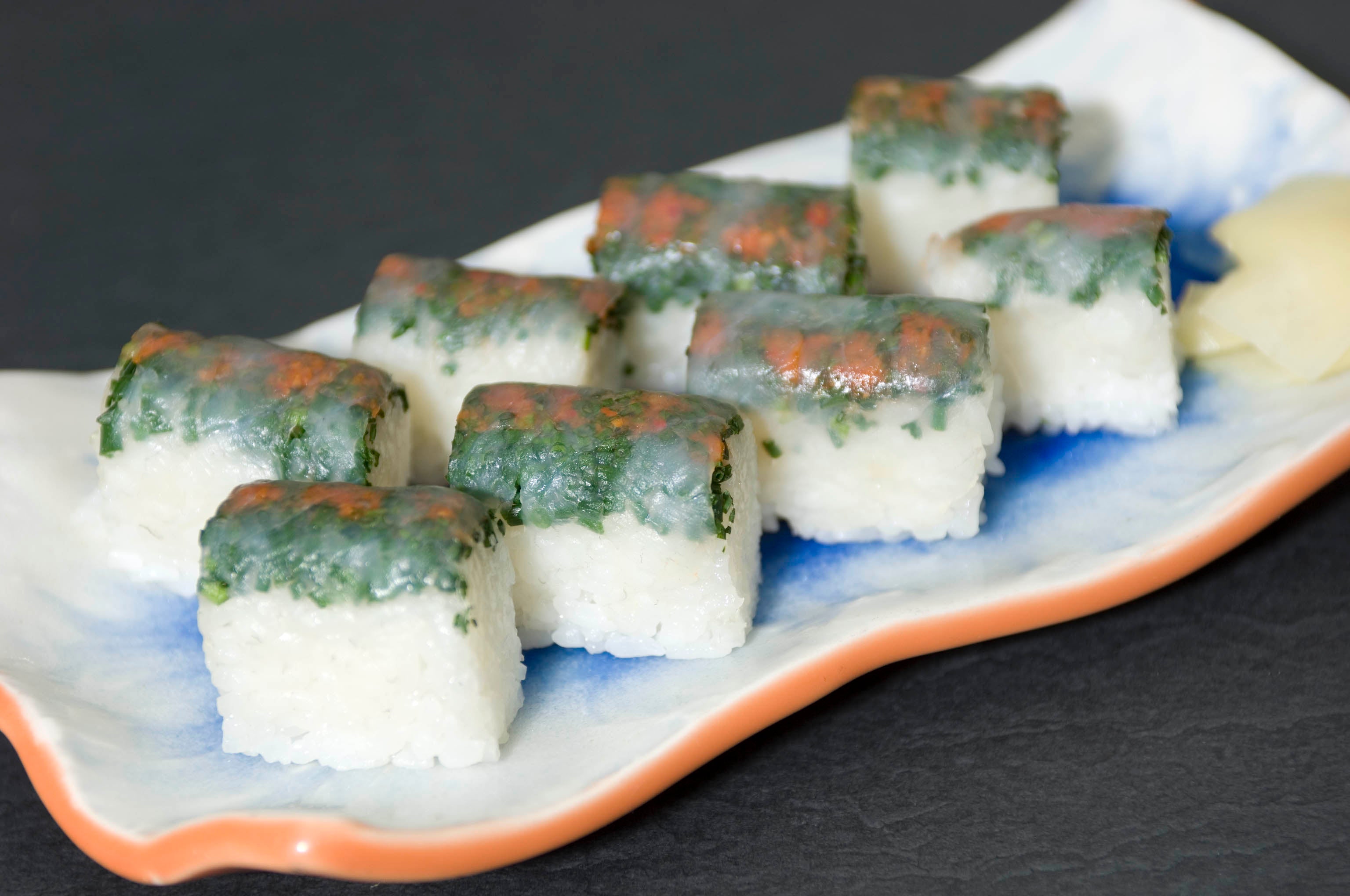 春帆楼の主役とらふぐと安岡葱、だいだいぽん酢といった名脇役達を贅沢に一口で味わえるふぐ寿司。 巻き寿司 にしてご用意しております。