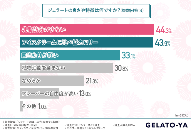 次に、「ジェラートの良さや特徴は何ですか?(複数回答可)」と質問したところ、『乳脂肪分が少ない(44.3%)』と回答した方が最も多く、次いで『アイスクリームに比べ低カロリー(43.9%)』『口当たりが軽い(33.1%)』『植物油脂を含まない(30.8%)』『なめらか(21.3%)』と続きました。