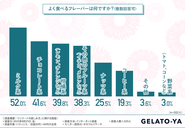 次に、「よく食べるフレーバーは何ですか?(複数回答可)」と質問したところ、『ミルク系(52.0%)』と回答した方が最も多く、次いで『チョコレート系(41.6%)』『柑橘系(レモン、オレンジなど)(39.8%)』『その他のフルーツ系(イチゴ、メロンなど)(38.3%)』『ナッツ系(25.5%)』と続きました。
