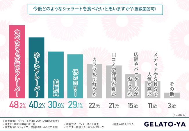 最後に、「今後どのようなジェラートを食べたいと思いますか?(複数回答可)」と質問したところ、『食べたことが無いフレーバー(48.2%)』と回答した方が最も多く、次いで『珍しいフレーバー(40.2%)』『低糖質(30.9%)』『低カロリー(29.1%)』『カラフルで鮮やか(22.7%)』と続きました。