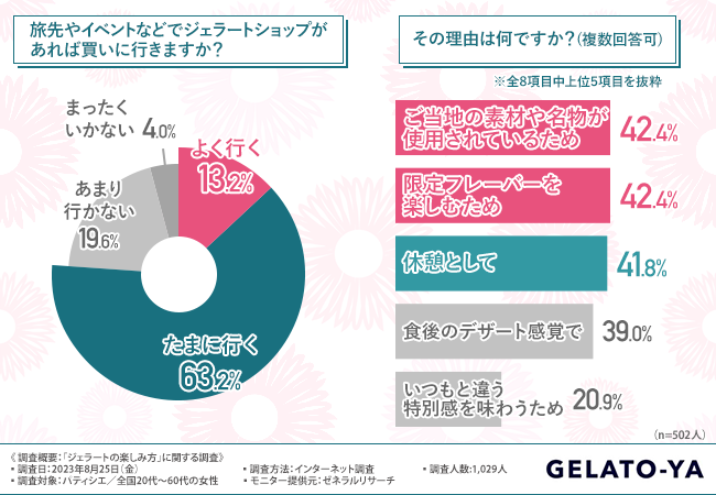 また、全国20代~60代の女性のおよそ8割が、旅先やイベントでもジェラートを食べると回答しました。
