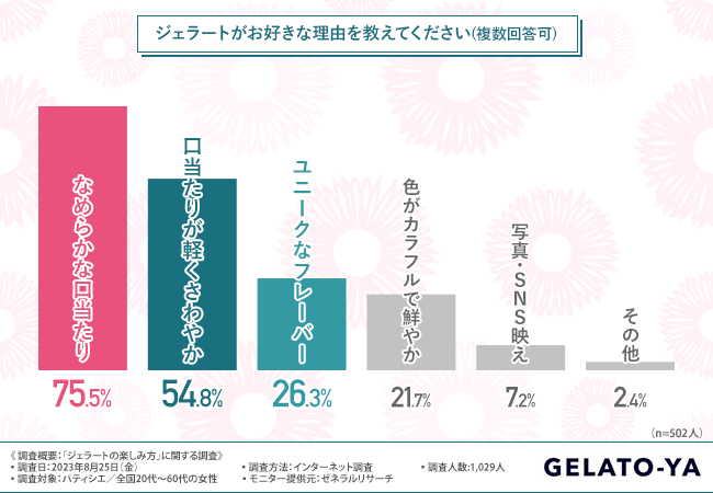 まず初めに、「ジェラートがお好きな理由を教えてください(複数回答可)」と質問したところ、『なめらかな口当たり(75.5%)』と回答した方が最も多く、次いで『口当たりが軽くさわやか(54.8%)』『ユニークなフレーバー(26.3%)』『色がカラフルで鮮やか(21.7%)』『写真・SNS映え(7.2%)』と続きました。