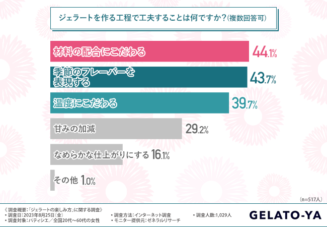 次に、「ジェラートを作る工程で工夫することは何ですか?(複数回答可)」と質問したところ、『材料の配合にこだわる(44.1%)』と回答した方が最も多く、次いで『季節のフレーバーを表現する(43.7%)』『温度にこだわる(39.7%)』『甘みの加減(29.2%)』『なめらかな仕上がりにする(16.1%)』と続きました。