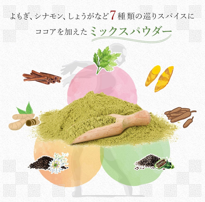 よもぎベースの「おいしく ととのう」スパイスラテをコンセプトとして、薬膳料理研究家監修のもと、話題の巡りスパイス「ヒハツ」、「ブラッククミン」に、定番の「シナモン」、「しょうが」などを配合し、体がよろこぶ毎日飲みたいスパイスラテに仕上げました。