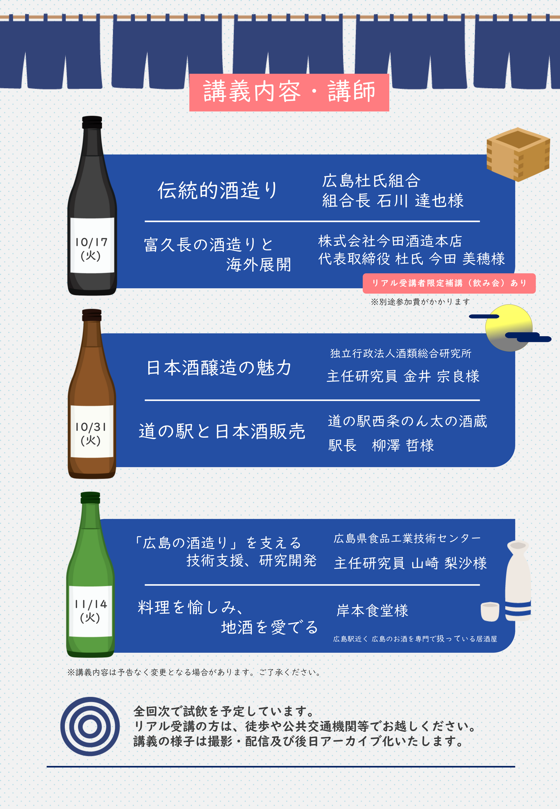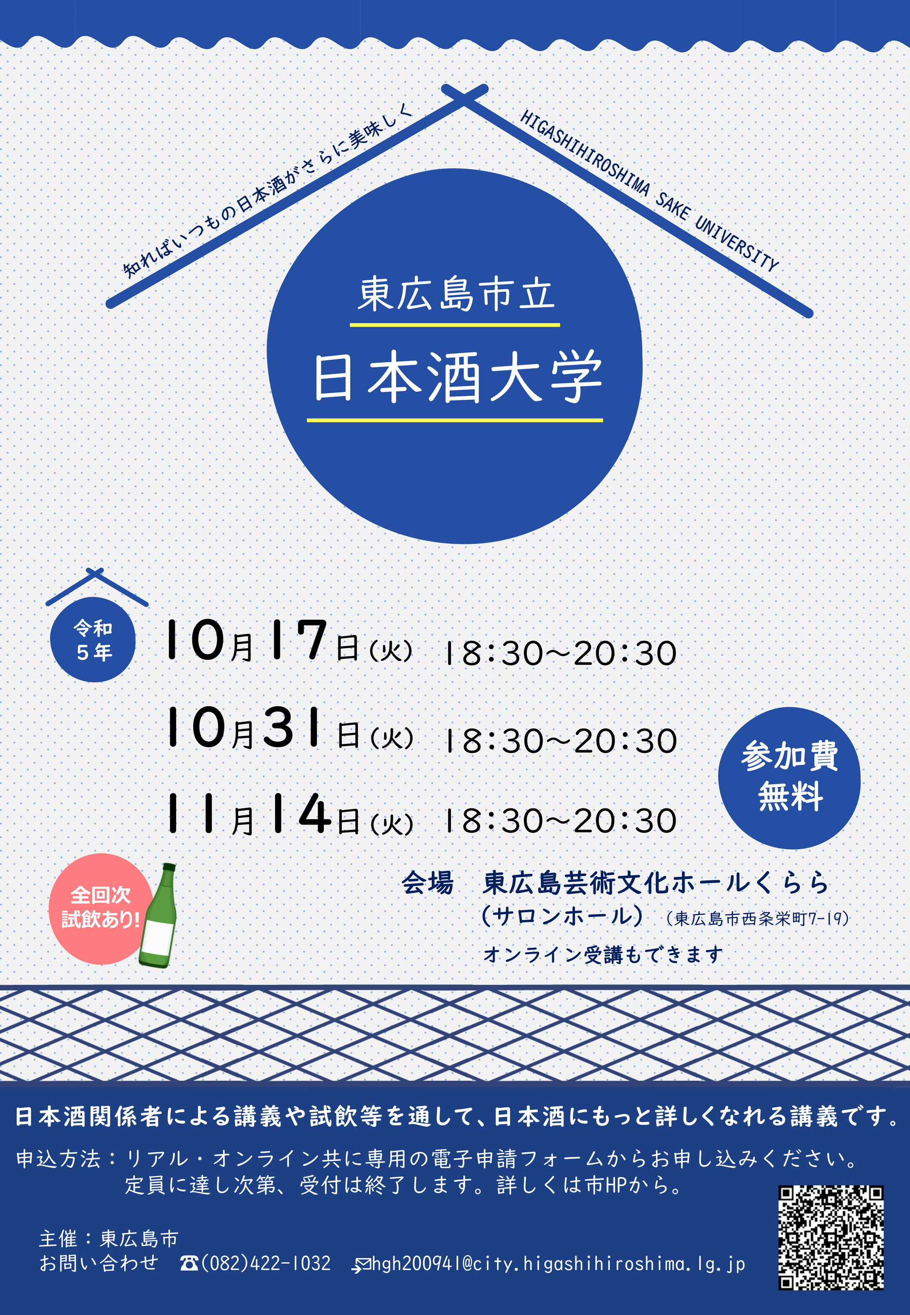 東広島市は、広島杜氏組合の石川達也組合長による伝統的な酒造りの話、世界からも注目される女性杜氏・今田美穂氏による酒造りと海外展開の話、国内唯一の酒類に関する研究機関「酒類総合研究所」研究員による日本酒のおいしさの秘密、広島の地酒専門店による料理と地酒の話など、オムニバス形式で講義をする「令和5年度東広島市立日本酒大学」を実施します。