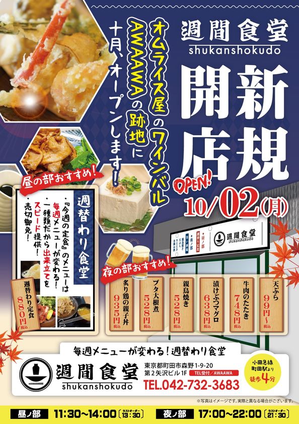 飲食店を運営する株式会社グランクール(所在地:東京都町田市 代表:雛倉 拓史)は、週替わりでメニューが変わるのが特徴の『週間食堂』を東京都町田市に2023年10月2日(月)オープンいたします。