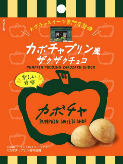 「カボチャプリン風ザクザクチョコ」はカボチャプリン風味が楽しめるひとくちサイズのクランチチョコです。