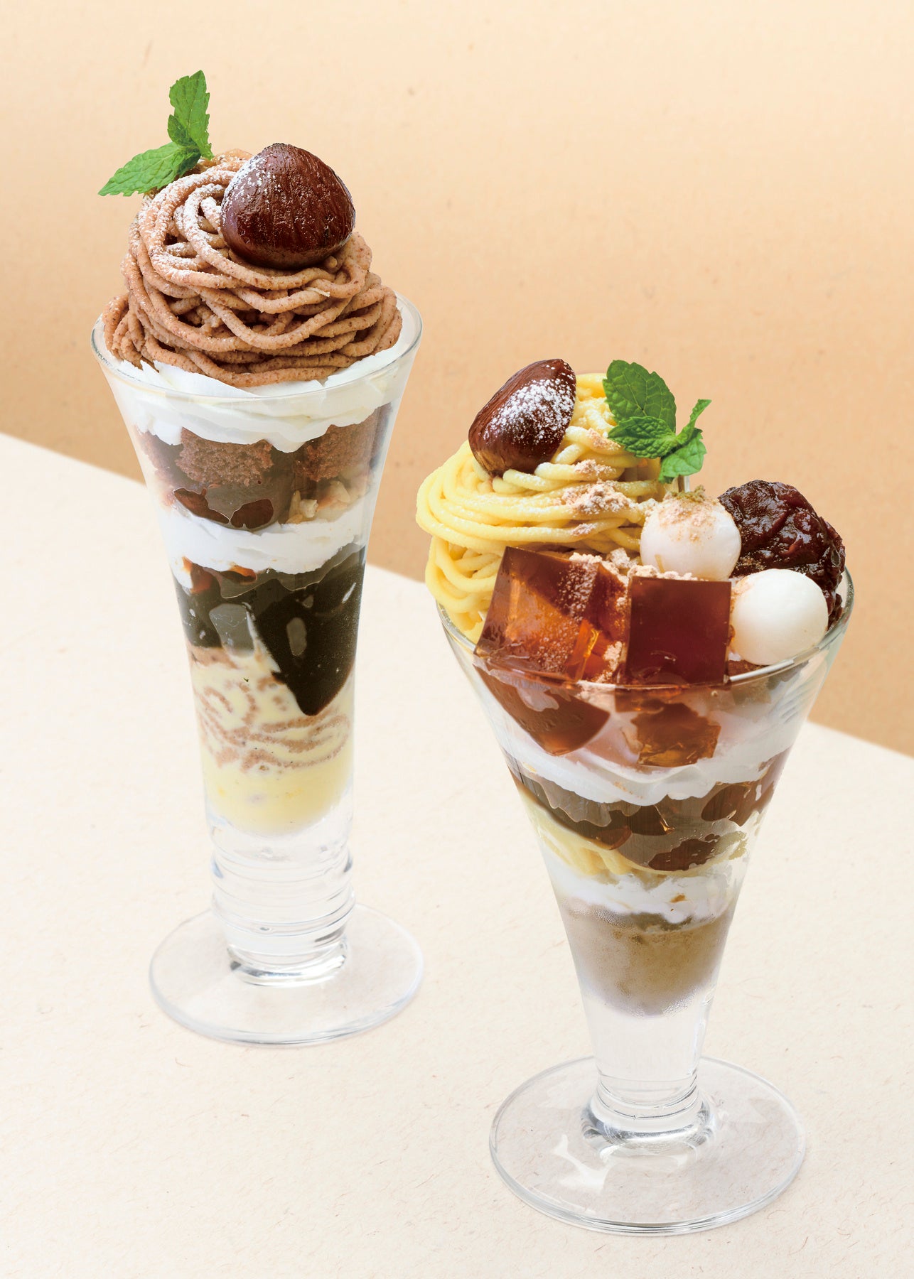 旬の栗のおいしさを存分にご堪能いただけるよう、素材を吟味して作った2つのパフェ。「ほうじ茶香る和風マロンパフェ」のほうじ茶は、香りが一番立つものをシェフが厳選。昨年人気だった「和栗のモンブランパフェ」には、銀座コージーコーナーオリジナルのブレンドコーヒーで仕立てた、ほどよい甘さと苦みのコーヒーゼリーを新たに盛り込みました。