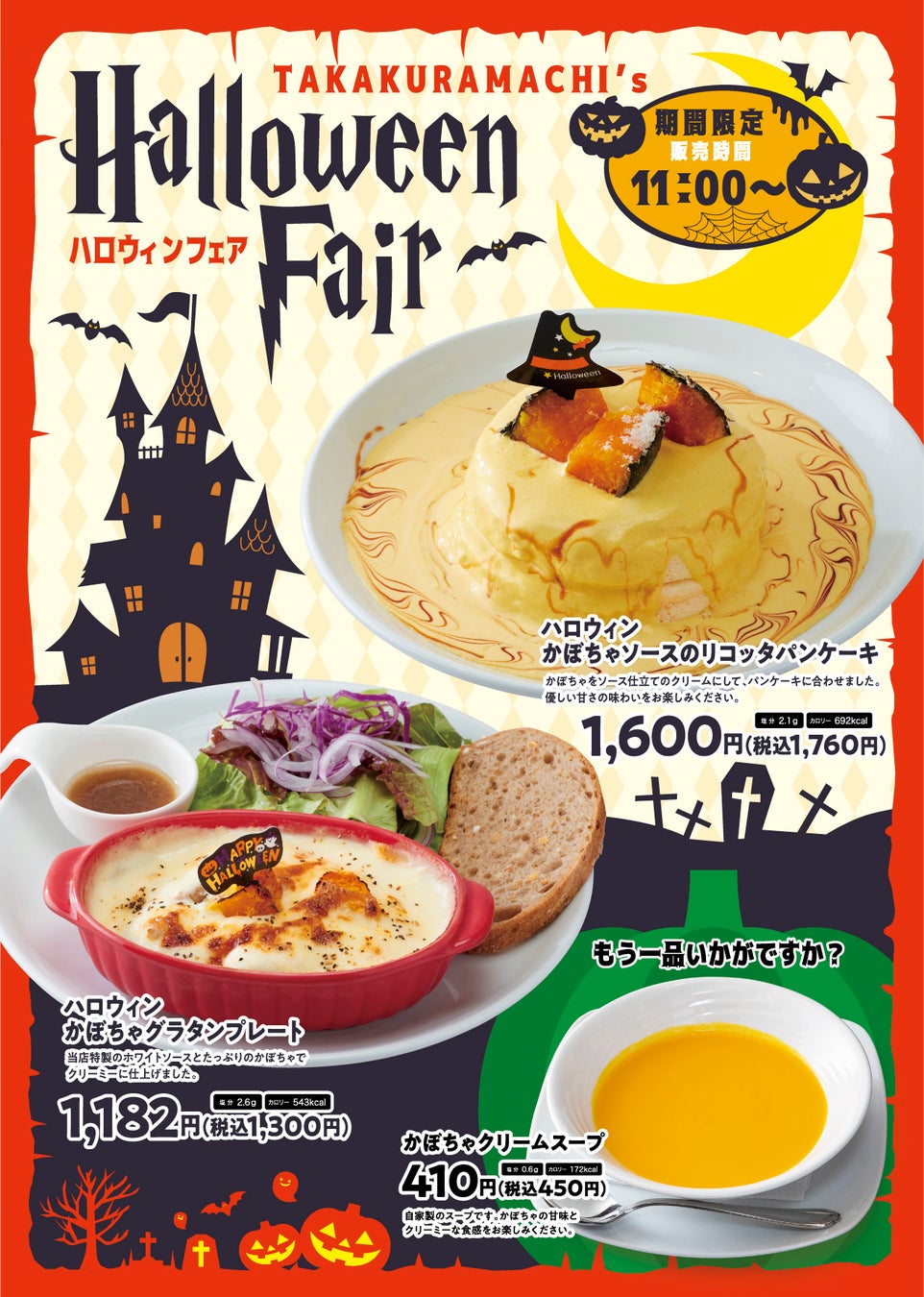 今年はハロウィン仕様のリコッタパンケーキが新登場!自家製のかぼちゃスープをソース仕立てのクリームにした、優しい甘さが特徴のパンケーキに仕上がりました。また自家製のホワイトソースと北海道産のホクホクなカボチャをクリーミーに仕上げた「かぼちゃグラタンプレート」や定番メニューの自家製「かぼちゃクリームスープ」がフェアメニューとして登場します!ハロウィンを満喫できる季節限定商品をぜひお楽しみください。