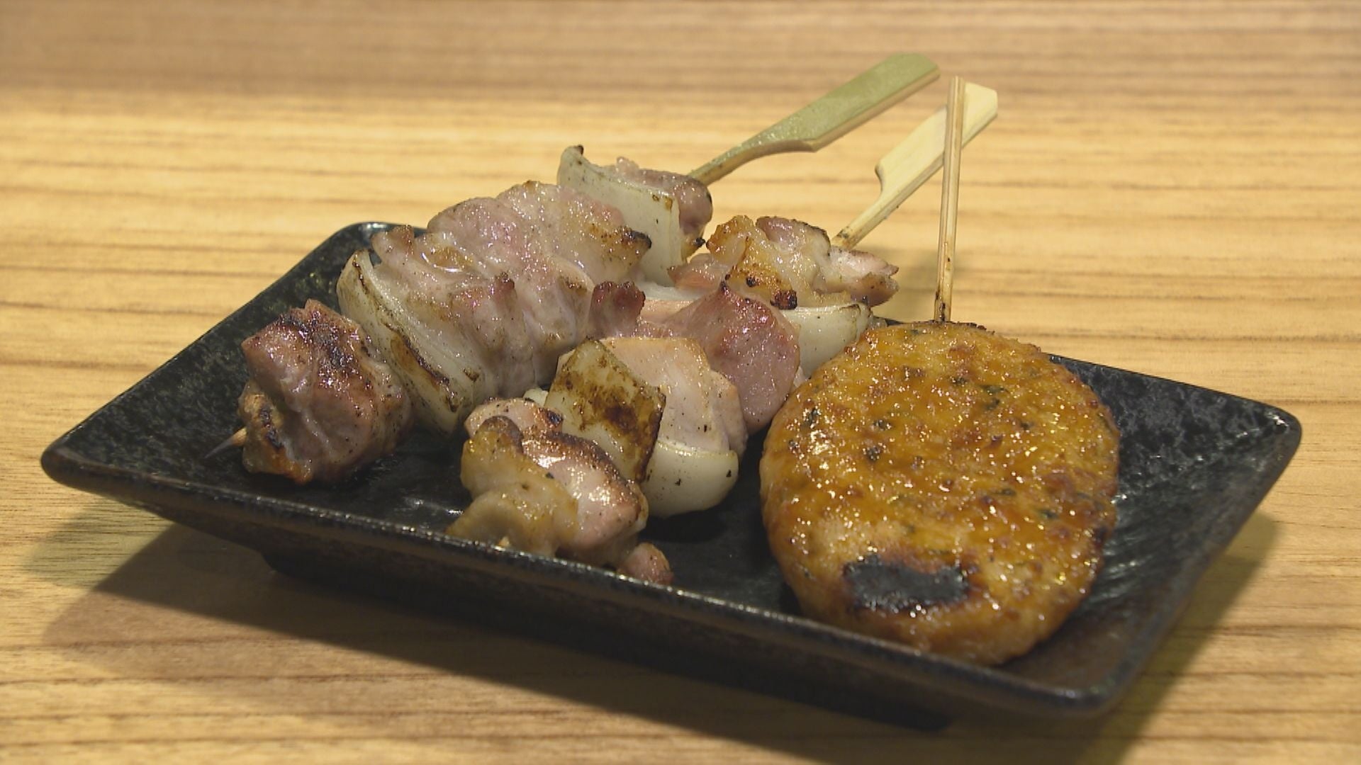 地鶏“長州黒かしわ”のもも串と長州鶏のつくね串のセット。長門流で召し上がれ