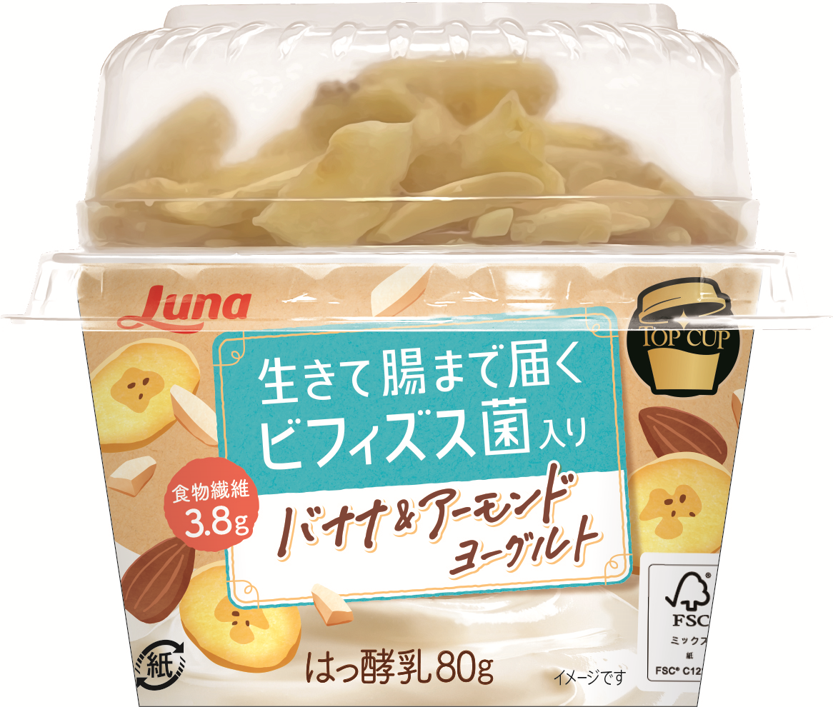 『TOPCUP バナナ&アーモンド ヨーグルト』は、生きて腸まで届くビフィズス菌入りのヨーグルトに、上部の添付カップに入ったバナナチップとアーモンドを混ぜて食べるTOPCUPタイプの商品です。