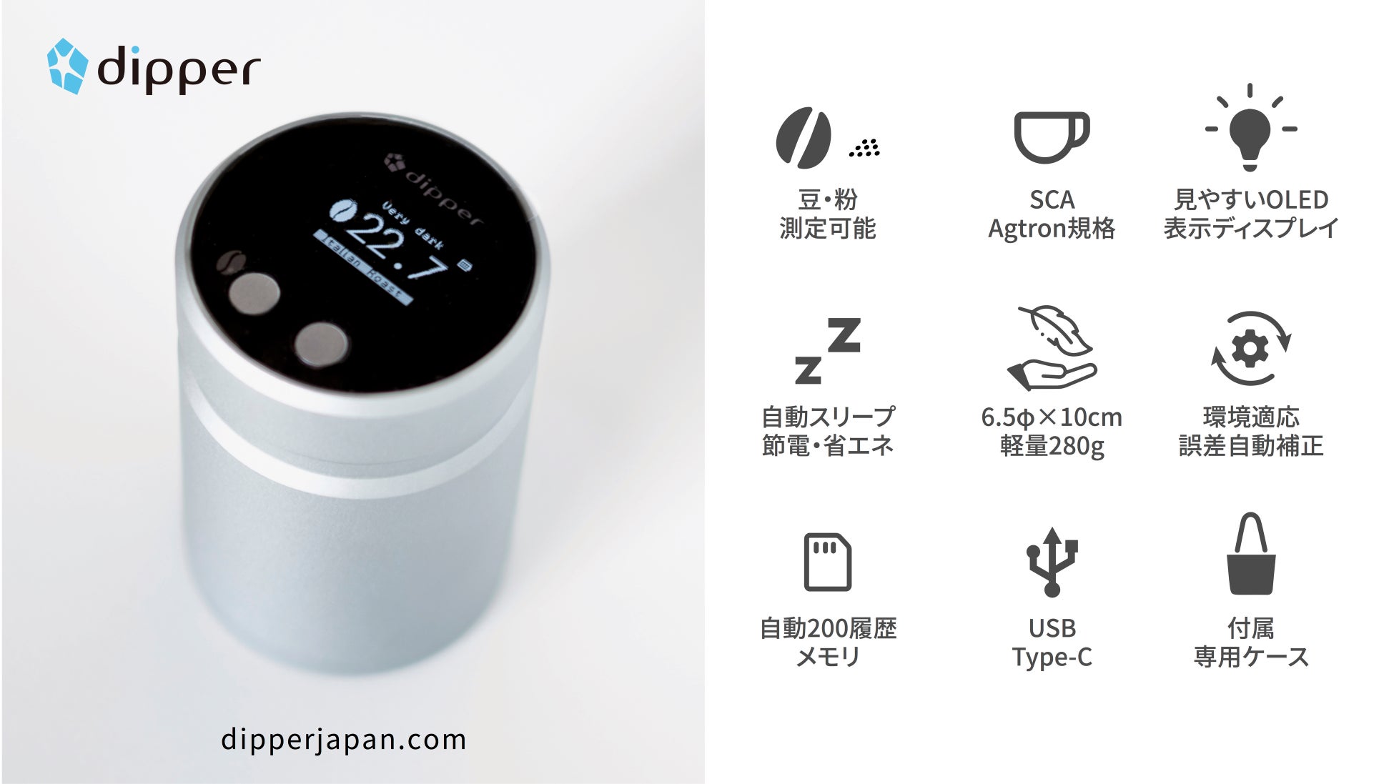 “dipper”は、コーヒーの豆・粉の焙煎度合いをデジタル計測する、コーヒー焙煎度測定機です。