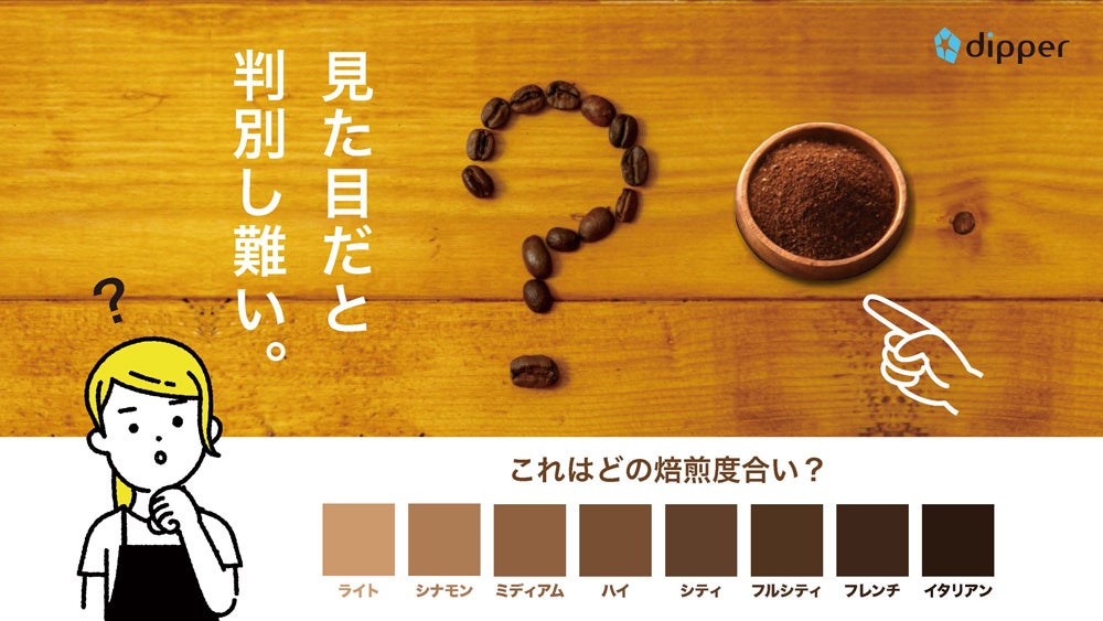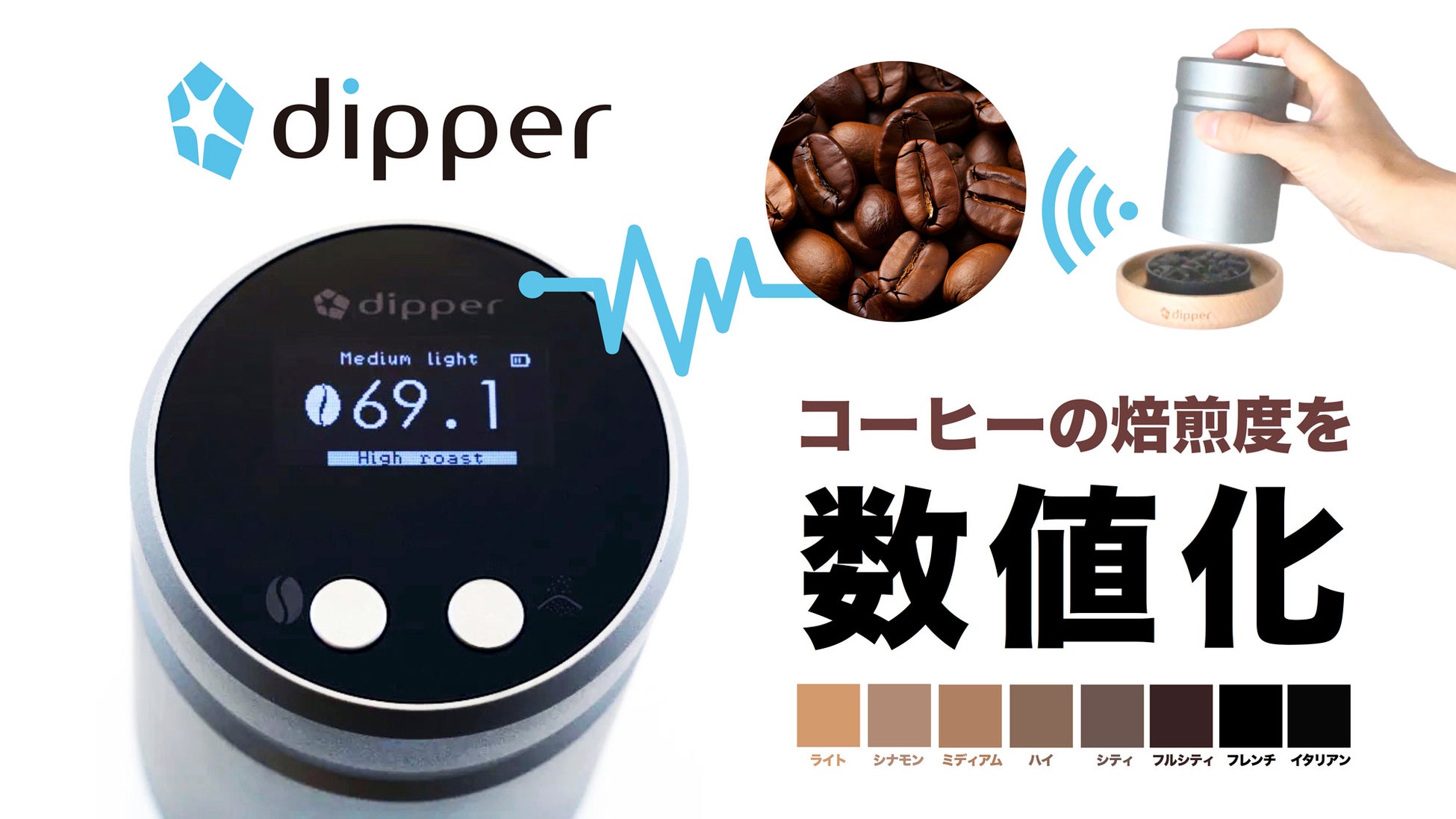 手のひらサイズの焙煎測定機「dipper」が、コーヒー豆の焙煎度を測って瞬時に数値化します。これからの焙煎度の判定は経験や見た目、色見本に頼った自己判断ではなく、より確度の高いデジタル計測に変わります。