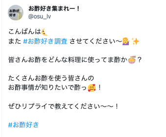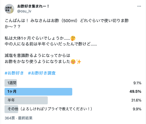 フォロワー数70,000人を超えるお酢が好きな「お酢好きさん」のための公式Twitterアカウント「お酢好き集まれー!」。本アカウントのフォロワーさんにお酢事情について聞きました。お酢好きさんたちは日々どれぐらいお酢を使っているのでしょうか?