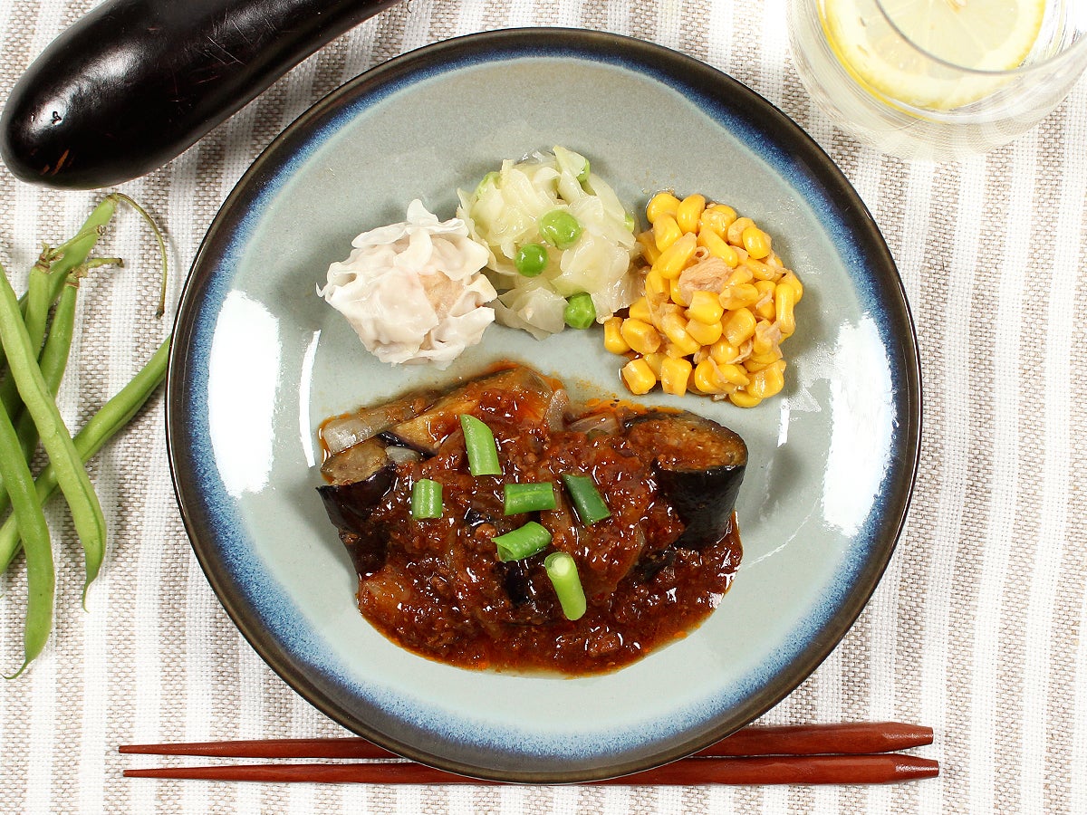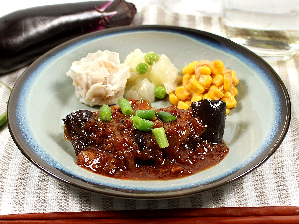 とろっと食感の茄子と玉葱に、テンメン醤と味噌で甘みとコクを出したピリッと辛い麻婆餡をかけました。野菜と餡をよく絡めてお召し上がりください。