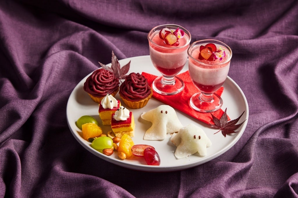 さつまいもやかぼちゃなど、代表的な秋の食材を取り入れつつ、ハロウィンカラーの紫をベースにまとめたティースタンドは、どことなく優雅でシックな装いで、昼から夕方、そして夜へ、時々刻々と表情を変える「chano-ma 秋葉原」の空間とともに、特別なひと時を演出します。