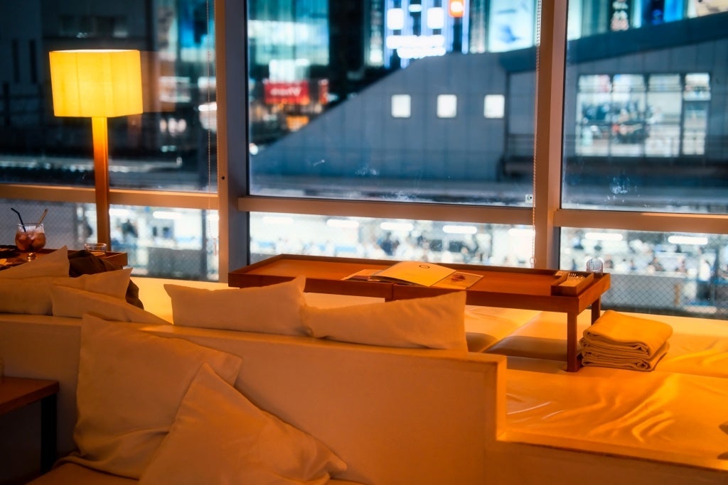 メインフロアは、一面のガラス窓から人々が行き交う秋葉原の街の賑わいを望むことができる小上がり座敷と、