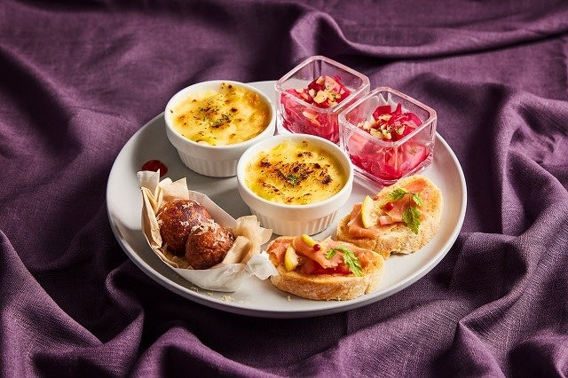 ・かぼちゃグラタン ・生ハムとレモンのブルスケッタ ・紫いもチーズボール ・りんごと赤キャベツのマリネ