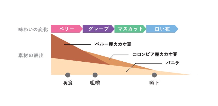 一口食べると、まずペルー産カカオ豆由来のベリーのような風味を感じ、さらに噛むごとにコロンビア産カカオ豆由来のグレープ、そしてマスカットの風味が現れます。余韻には白い花のようなフレーバーを感じていただけるでしょう。