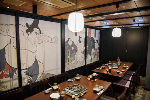 3. 和モダンな個室空間・・・店内は和を基調とした、木目の優しさと畳が香るモダンな雰囲気です。店内に描かれている相撲絵は、日本の伝統文化に触れながら食事を楽しめると海外からのお客様にも大変人気です。大小さまざまな個室をご用意しているため、プライベートな食事会にも最適です。