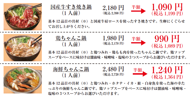 追加野菜セット・鶏もも肉・豚バラ・国産牛・生卵の追加具材も半額です。