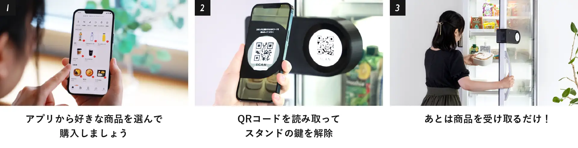 TukTukは、オフィスやマンション等の共有部に冷蔵庫型の店舗を設置してご利用いただく小型の無人コンビニです。お弁当、パンやインスタント食品などの軽食、デザート、お菓子、ドリンクといった食料品や日用品など、利用者のニーズに合わせて幅広い商品を取り扱っています。利用者は、専用のアプリを通じて商品を購入した後、QR コードを用いてロックを解錠することで、商品の受け取りができます。オフィスやマンションから出ることなくお食事や飲み物などを購入できるため、仕事や家事、育児に追われた生活の合間にお買い物をお楽しみいただけます。