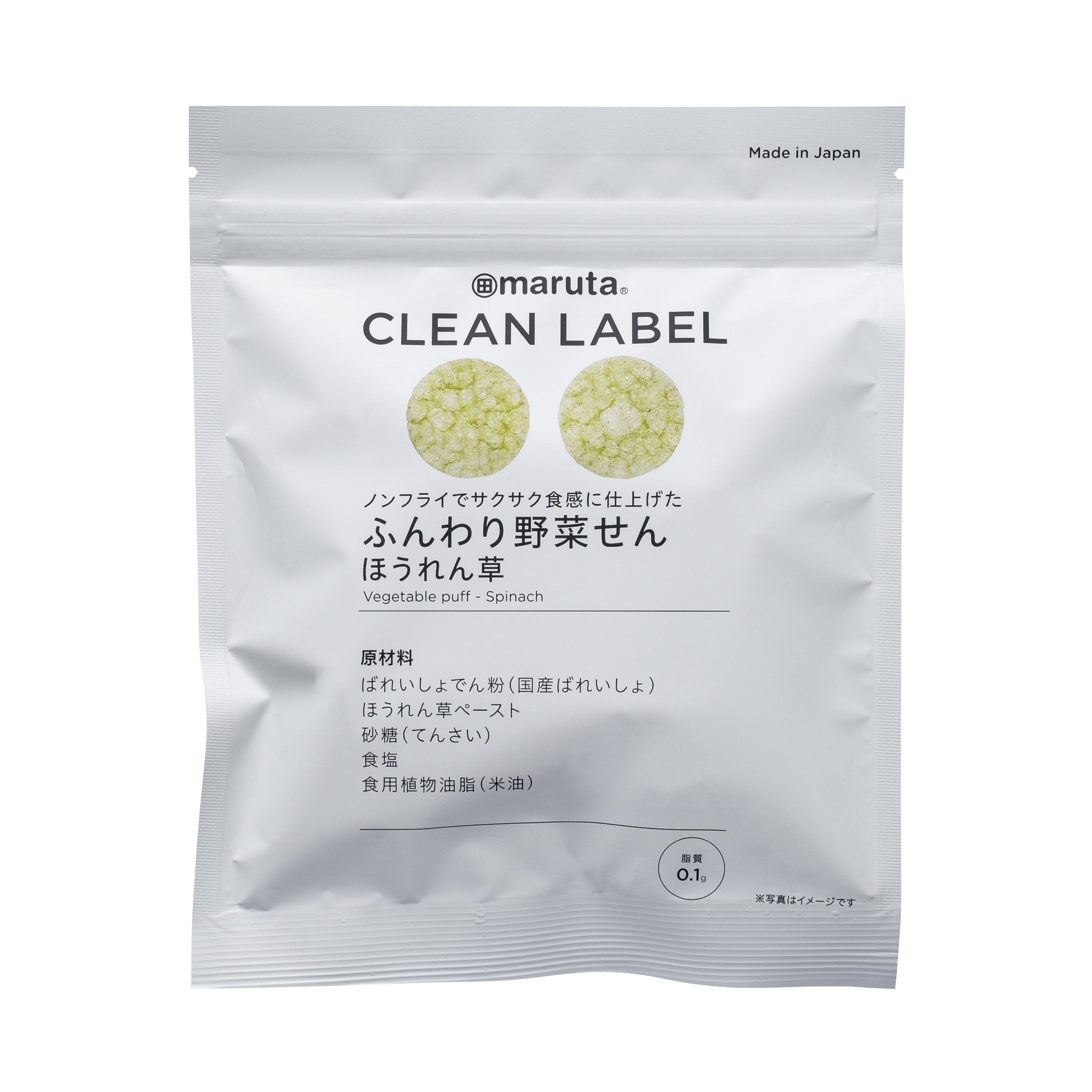 ばれいしょでん粉(ばれいしょ(国産))、ほうれん草ペースト、砂糖(てんさい)、食塩、食用植物油脂(米油)