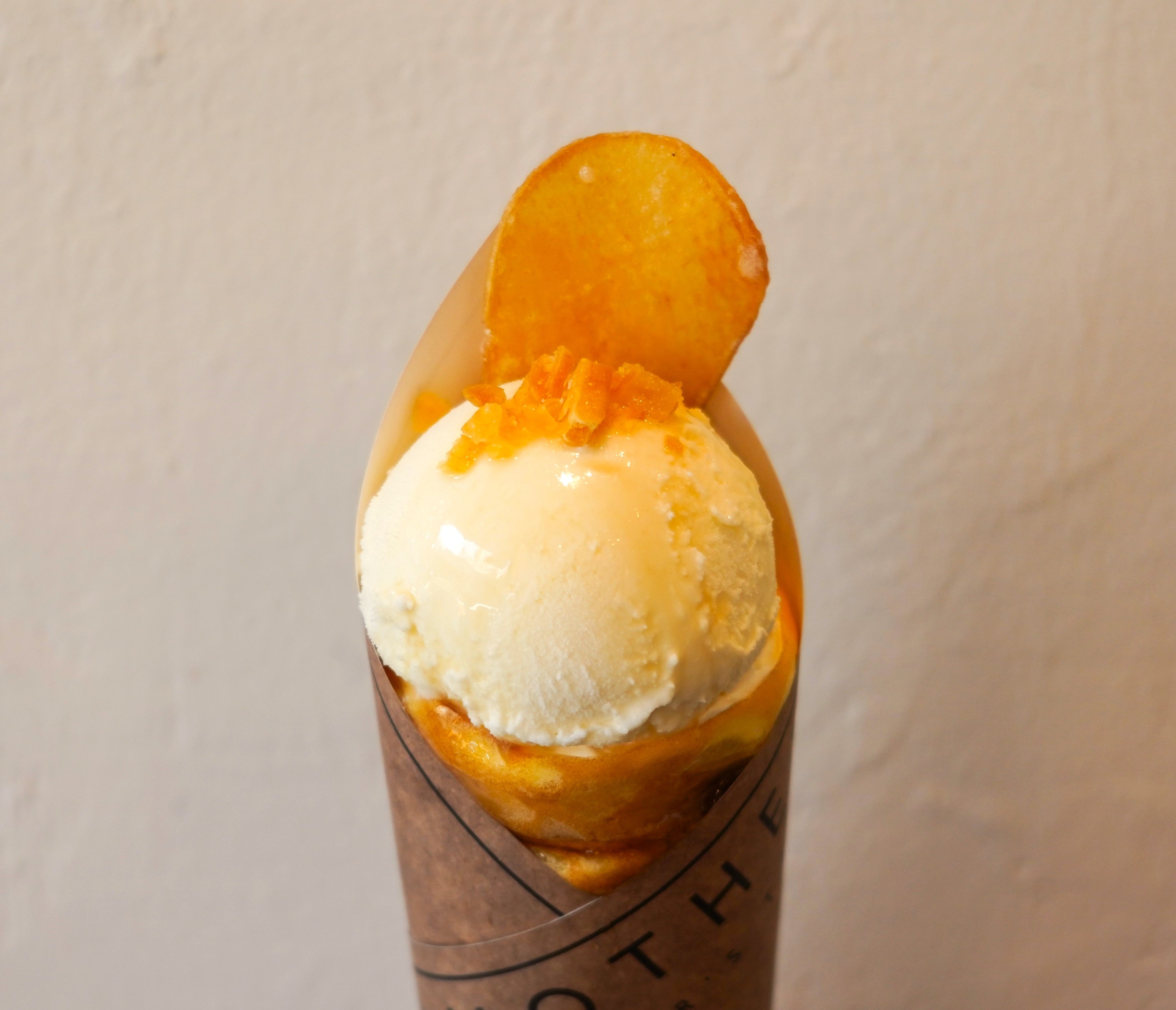 甘く煮たさつまいものグラッセ、黒胡麻のチュイールがアクセントのクレープ。大学芋の密やさつまいものグラッセ、さつまいものペーストなどはすべてハンドメイドです。