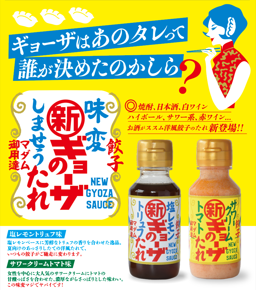 ご家庭の晩御飯+週末の宅飲みや、キャンプシーンなど様々な食シーンを盛り上げる新ギョーザのたれ「塩トリュフレモン&サワークリームトマト」を9月1日より全国で発売いたします