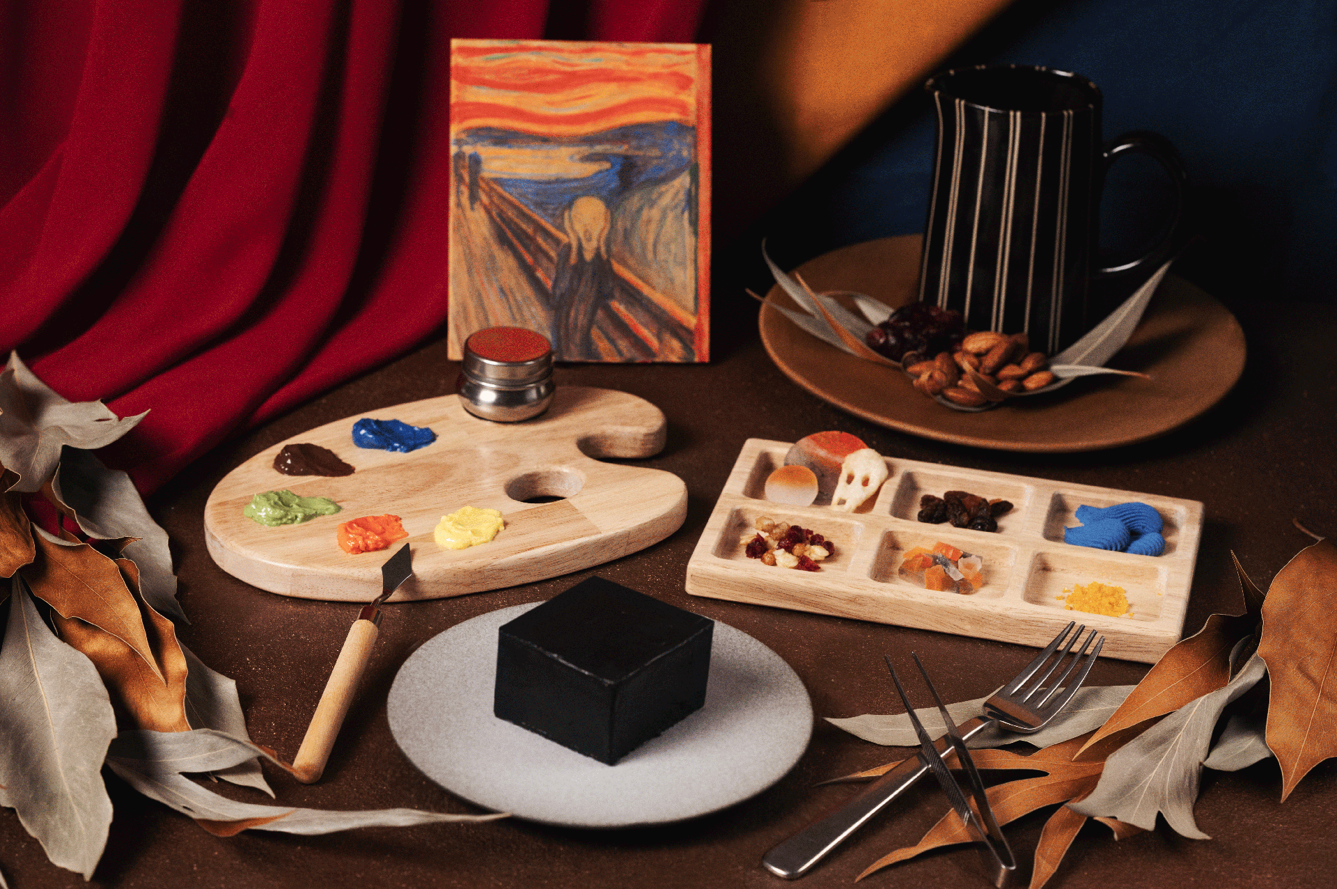 実際に油絵を描く際に使用する油壺(絵の具を溶く油をいれる道具)の中にはメープルシロップ、木箱に入ったトッピングパーツの中には”叫び”を彷彿とさせる彩りの琥珀糖やレーズン、パイ等が並びます。