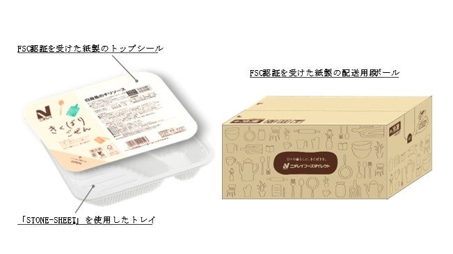 「きくばりごぜん™」シリーズでは、FSC認証を受けた紙製のトップシールに加え、「STONE-SHEET®︎」を使用したトレイを新たに採用いたします。従来のトレイと比較して、4割以上のプラスチックを削減することができます。