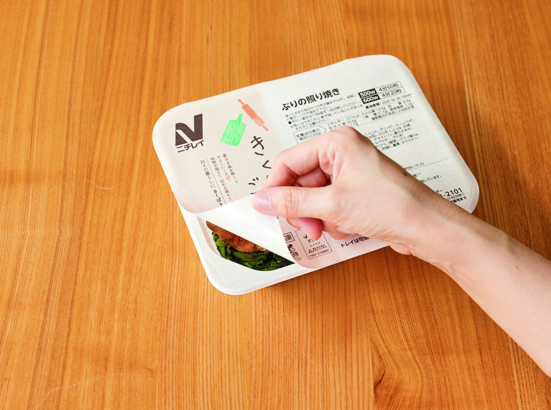 商品に使用するトレイ、フタ、配送用段ボールなどすべて環境に配慮した素材を使う「オール環境包材化」は、ニチレイフーズ初の取り組みです。