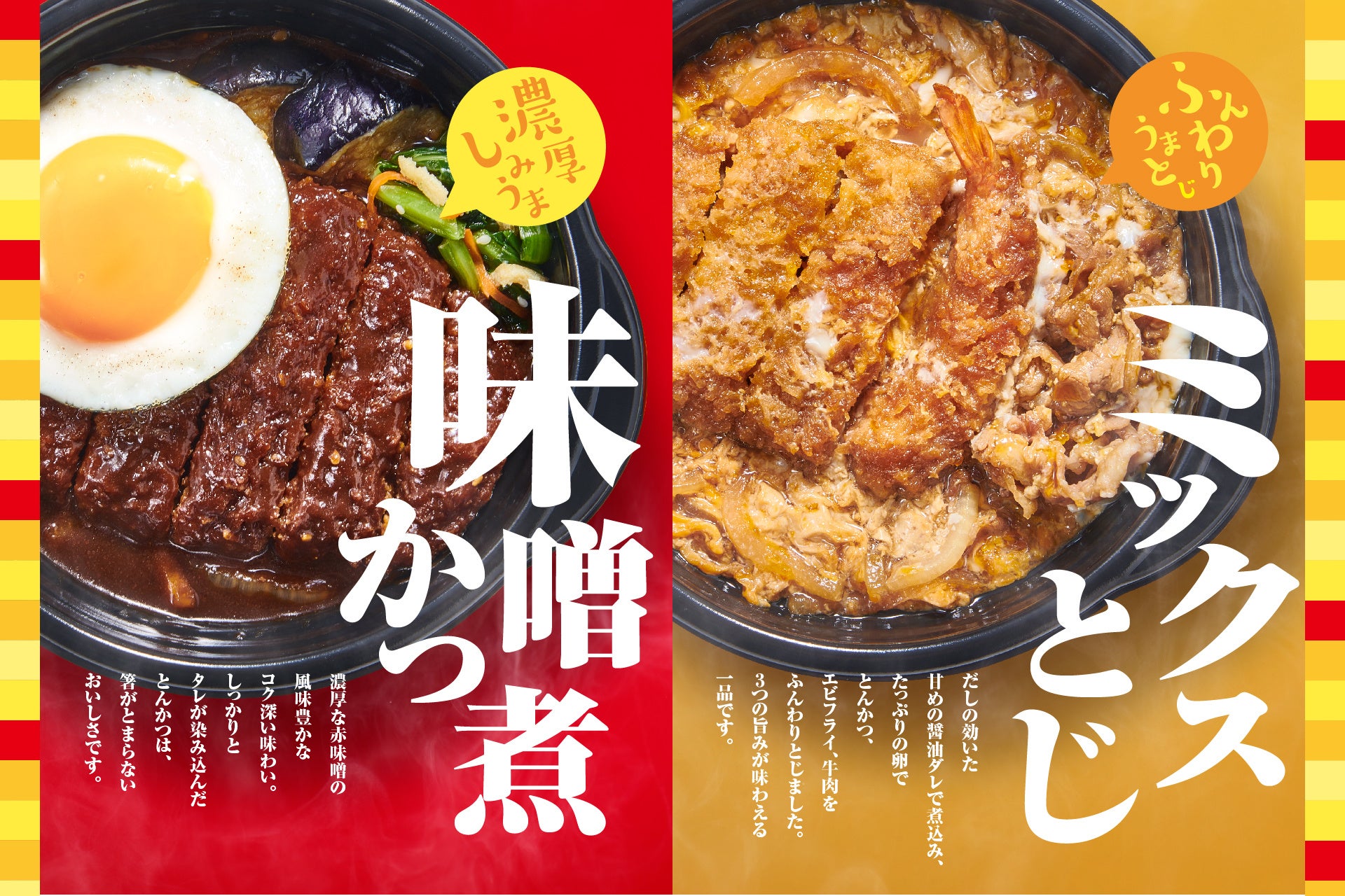 このたび「ほっともっと」では、秋も深まるこれからの季節に合わせ、選べる2種のあったかメニュー『しみうま濃厚 味噌かつ煮弁当』650円と『とんかつ・エビフライ・牛肉の たまごたっぷりミックスとじ弁当』690円を、2023年10月4日(水)より新発売いたします。