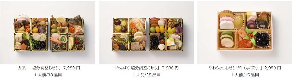 おせち料理は保存するために味が濃く、塩分が高いものが一般的ですが、当社が販売する「カロリー・塩分調整おせち」はエネルギーと塩分を調整するために、塩分が極力低い食材を使用しており、1段あたりの食塩相当量は4.0g未満となっています。また、「たんぱく・塩分調整おせち」はエネルギーや塩分だけでなく、たんぱく質やカリウム、リンなども調整することで食塩相当量を1段あたり4.0g未満に抑えつつ、たんぱく質摂取量も控えながらエネルギー量が低くなりすぎないようにいも類やデザート系を多く使用しています。そのほか、噛む力が弱くなった方のためにテリーヌやムースでかたどった海老などのやわらかい食材を集めた「和(なごみ)」もご用意しており、栄養価の調整が必要な方でもおせち料理を食べる楽しみやお正月気分を味わえるように作っています。