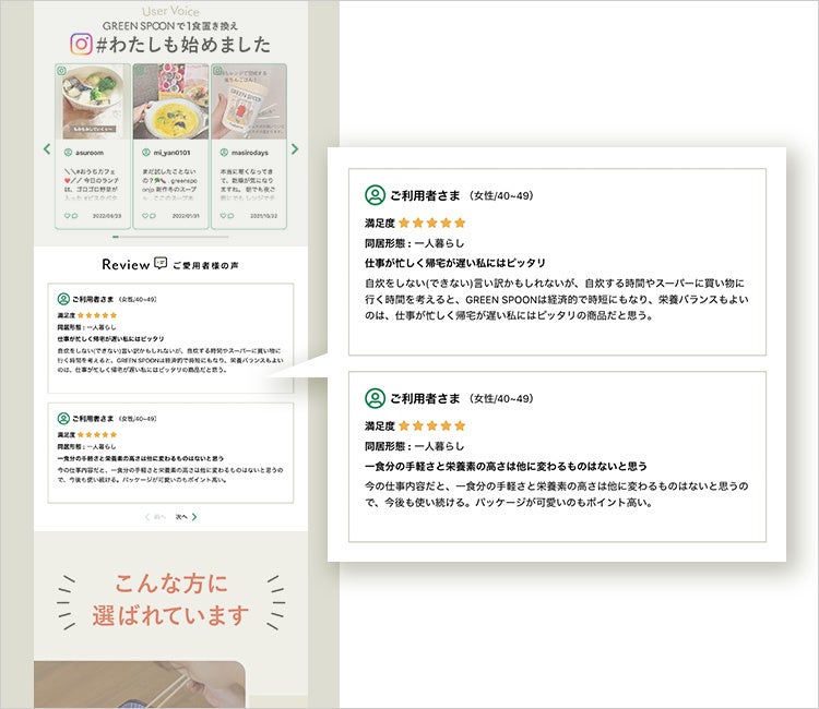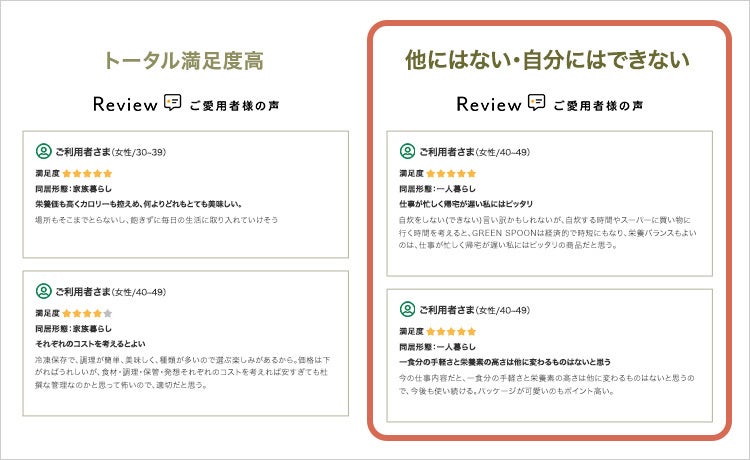 さらに、より大きな改善を実現するために、GREEN SPOONを既に愛用しているユーザー向けに実施した調査データから、新たなレビューカテゴリを設計。複数のカテゴリに分類し、比較検証を実施したところ、「他にはない・自分ではできない」訴求のレビューが高い成果を上げました。