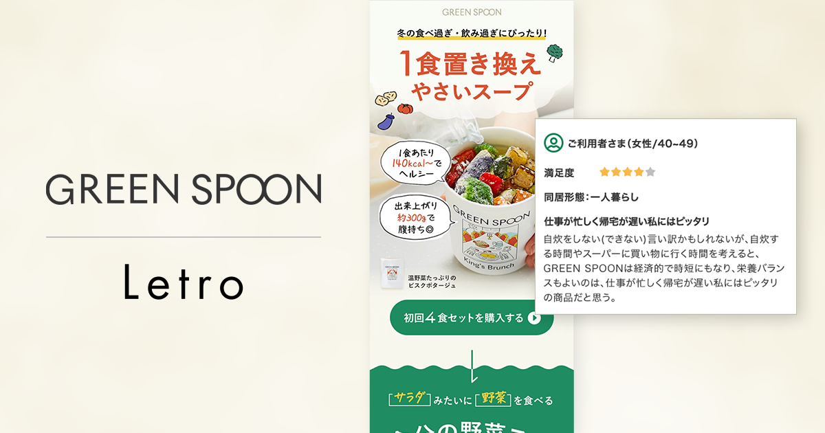 企業のマーケティングDXを支援するアライドアーキテクツ株式会社(東京都渋谷区、代表取締役社長 CEO:中村壮秀、証券コード:6081)でSaaS事業を展開するプロダクトカンパニー(プレジデント:村岡弥真人)は、株式会社Greenspoon(東京都渋谷区、代表取締役CEO:田邊 友則、以下GREEN SPOON)に対し、当社のCVR最適化プラットフォーム「Letro(レトロ)」を活用して、新規顧客向けLPにおける獲得成果向上のためにレビュー(※1)活用の支援を行いました。その結果、ベジタブル・ワンステップミール「GREEN SPOON」の定期顧客の獲得LPにおけるレビュー運用でCVR1.7倍を実現しました。