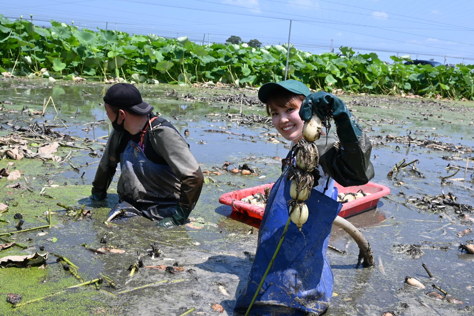 2023年7月28日(金)には、社内研修として農業体験に行きました。1-2月に季節限定で使用した「古代れんこん」の農家さんを訪問し、実際に収穫体験しながら農家さんの苦労や想いを体感することができました。