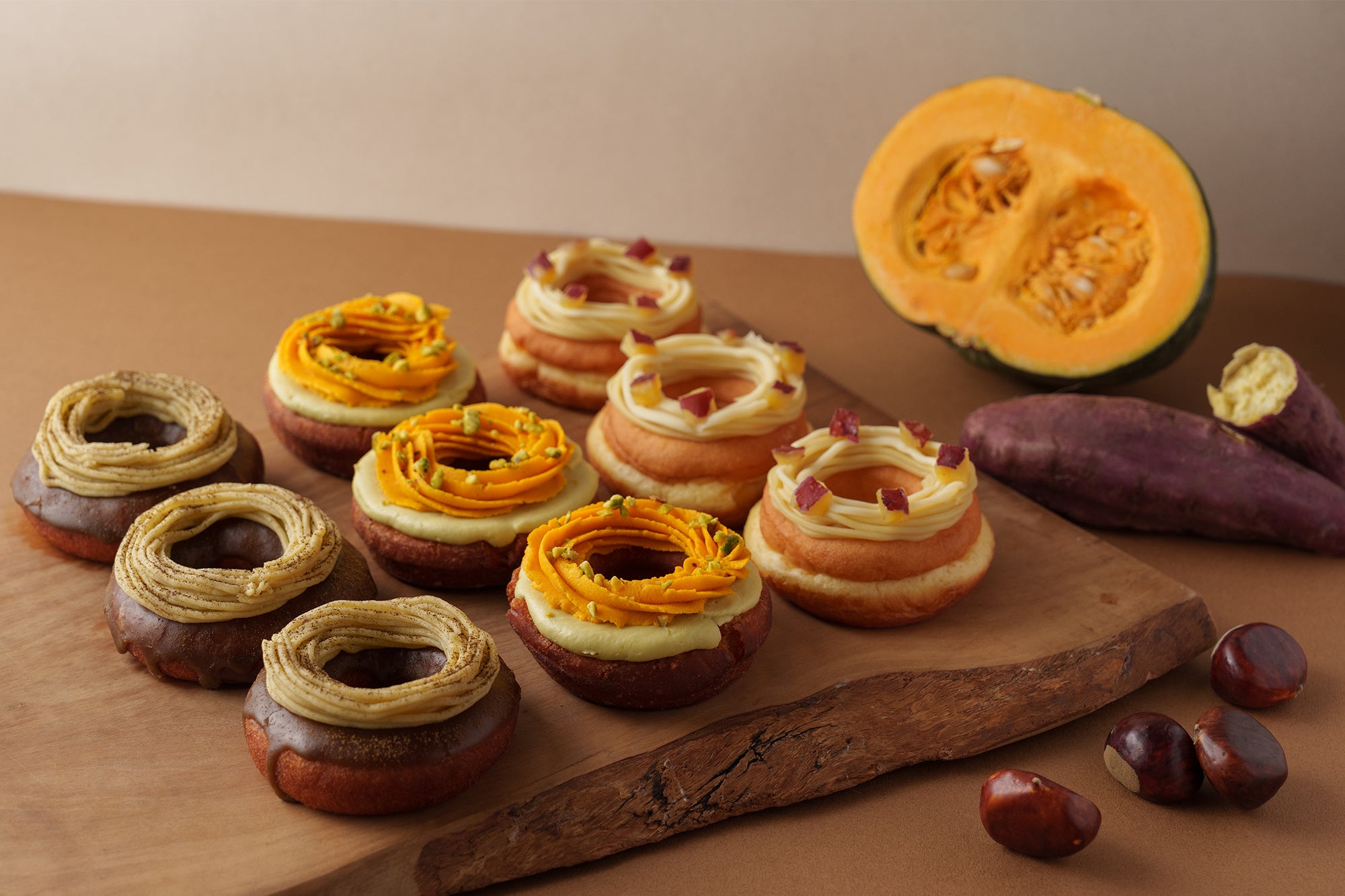 レギュラードーナツからは、日本の秋の恵み「いも・栗・かぼちゃ」を使用した3種類の新メニューをご用意いたしました。もちもち生地が魅力の「もちもち 丹波栗とほうじ茶モンブラン」は、京都の日本茶専門店“YUGEN”のほうじ茶グレースに、丹波栗を贅沢に使用したクリームをたっぷりと絞りました。オールドファッション生地の「有機かぼちゃとピスタチオチーズ オールドファッション」は、国産の有機かぼちゃクリームとピスタチオチーズクリームを組み合わせ、ふわふわ生地の「ふわふわ 国産有機さつまいもとオレンジホワイトチョコ」には、国産の有機さつまいもに爽やかなオレンジ風味のホワイトチョコをトッピング。和と洋が織りなす、秋限定のドーナツをぜひご賞味ください。