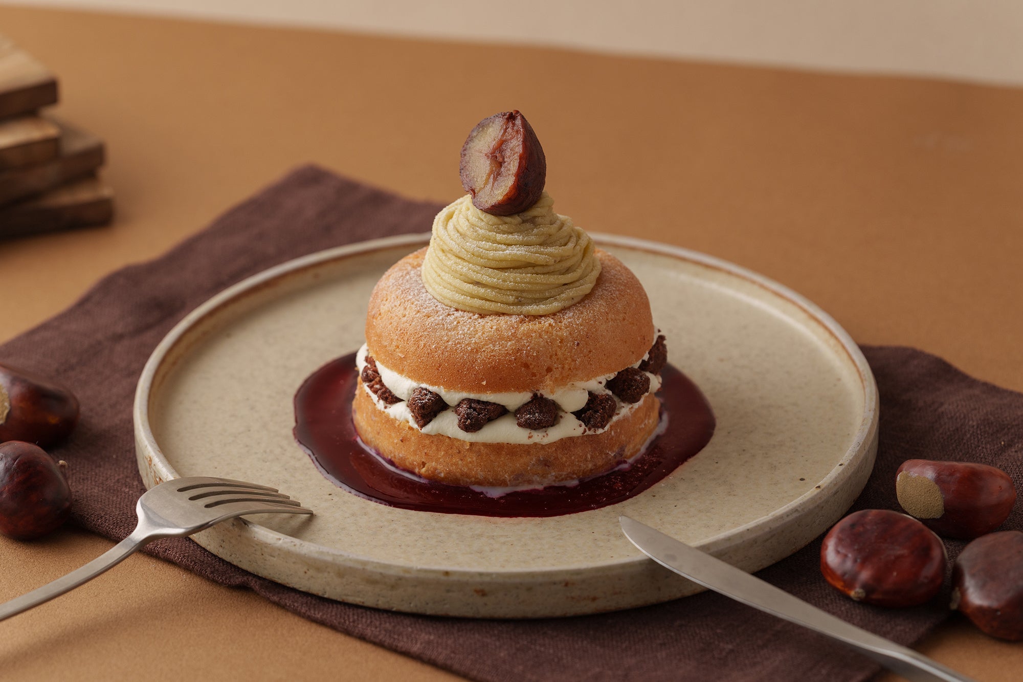 京都産丹波栗を贅沢に使用したクリームを、京都の日本茶専門店”YUGEN”のほうじ茶グレーズにたっぷりと絞りました。