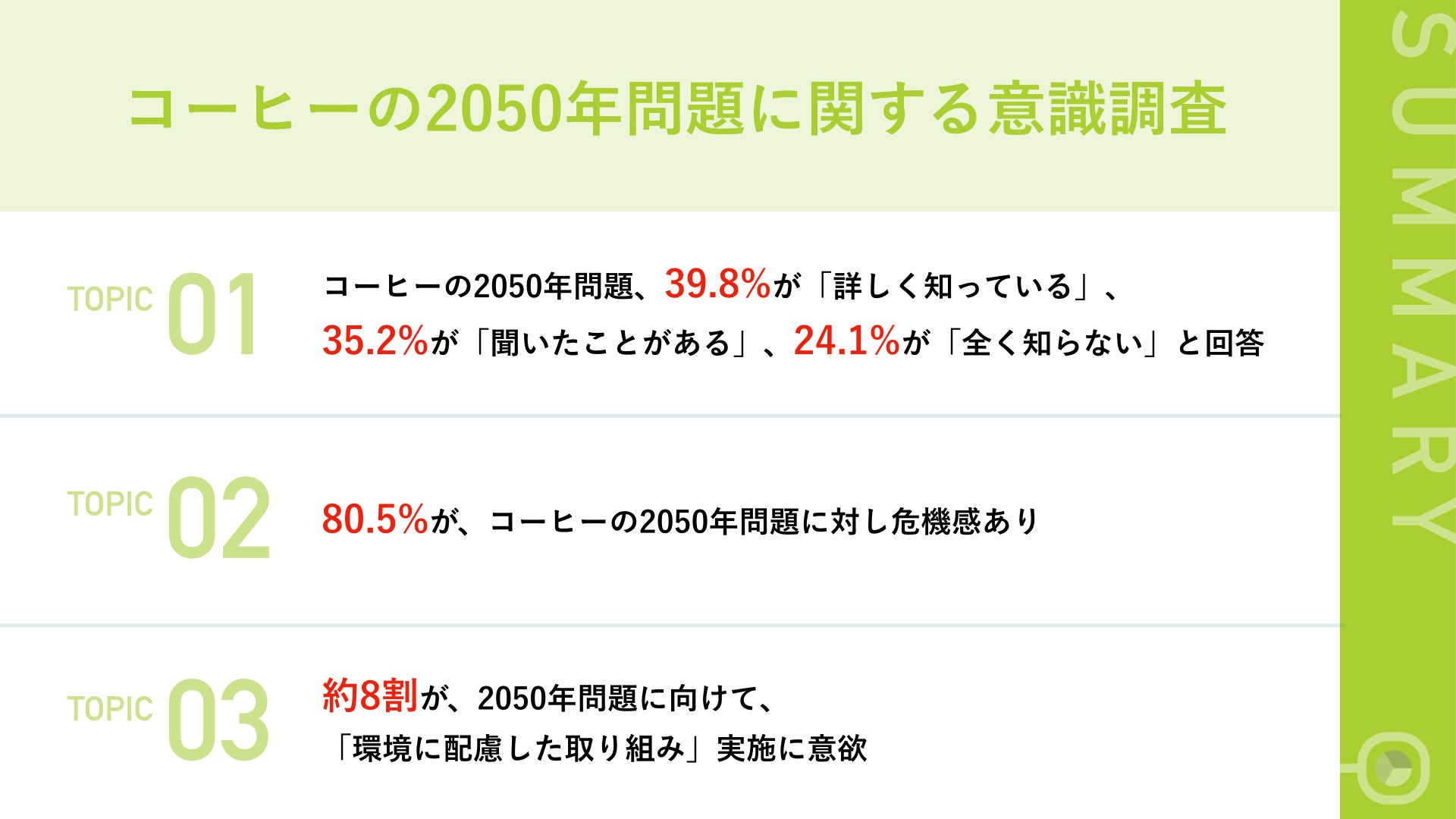 ※「コーヒーの2050年問題」とは、世界で消費されるコーヒーの約7割を占めるアラビカ種の栽培に適した土地が、気候変動から2050年には半減するという予測を指し、深刻なコーヒー不足が起こると懸念されていることを指します。