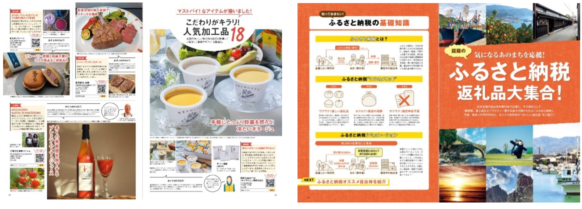 各地から厳選した逸品を、肉、野菜、果物などジャンル別に、生産者たちの声とともに紹介。二次元コードから通販情報ページへアクセスできる、便利な構成になっています(※一部、現地でのみ購入できる商品や、季節が限られている商品も掲載しています)。お薦めの簡単レシピ、ふるさと納税返礼品情報、生産者に聞いた「牛肉のおいしい食べ方」などコラムも充実しています。