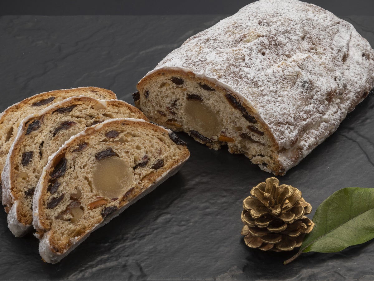 洋酒に漬けたオレンジ、レーズンなどのドライフルーツやバター、くるみを生地に練り込み焼き上げたドイツ伝統のクリスマス菓子です。