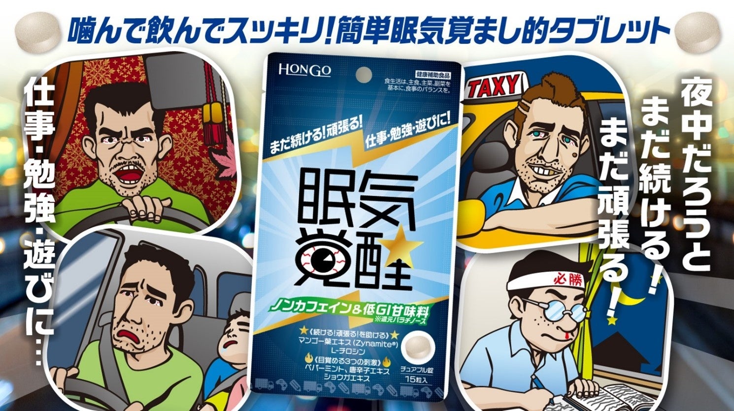近年トラック業界はEC繁栄の影響で繁忙を極め、タクシー業界もドライバー不足により繁忙を極めており、加えて営業ドライバーの高齢化も追い打ちをかけております。そんな皆さまの疲弊した心身を気遣い、よりカラダにやさしいノンカフェインの眠気対策商品を開発しました。