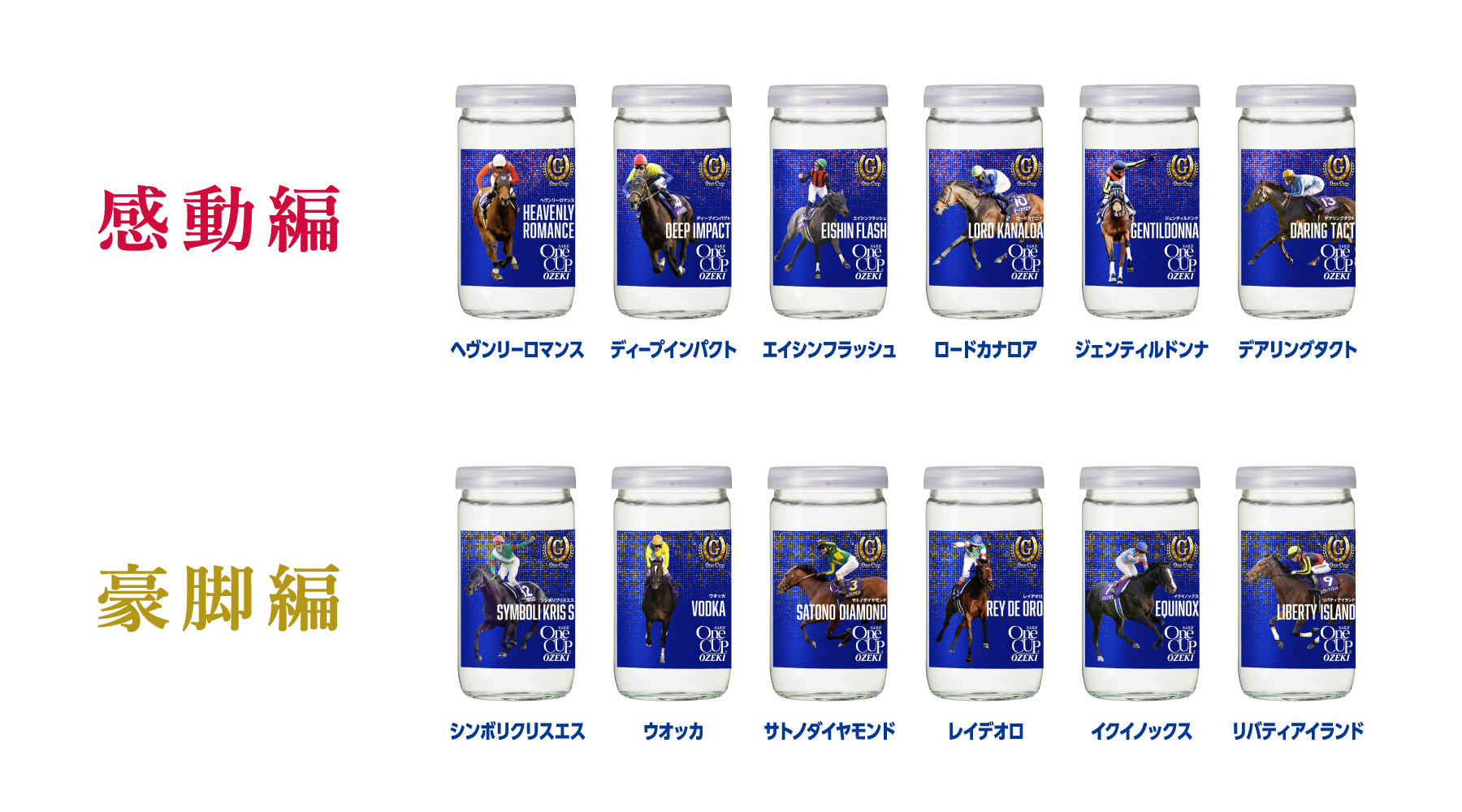 秋のGIレースをより一層盛り上げるため、「上撰ワンカップ180ml瓶詰(G-OneCup)」第二弾は過去に日刊スポーツの紙面を飾ったGIレース優勝馬を『感動編』と『豪脚編』の二つのテーマでワンカップ大関のラベルにデザインしました。