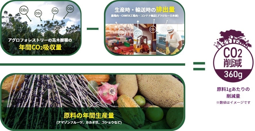 CO2削減マークは、ブラジルのトメアスを拠点とするサプライヤーのトメアス総合農業協同組合(以下CAMTA)が生産する、アサイーをはじめとするアマゾンフルーツの原料を使用した製品に表示しており、その他の製品につきましても順次マークを添付していく予定です。