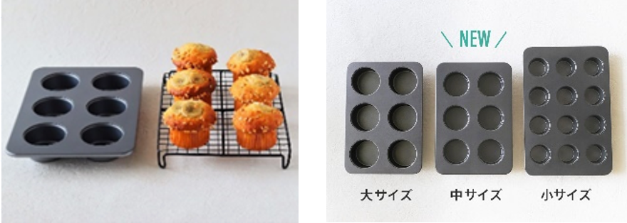 生地を流し込む部分が垂直に立ち上がり、かわいいきのこ型に焼き上がる垂直マフィン型。新たに中サイズが加わったことで、パンやスイーツなどマフィン型レシピのバリエーションをこれまで以上にお楽しみいただけます。