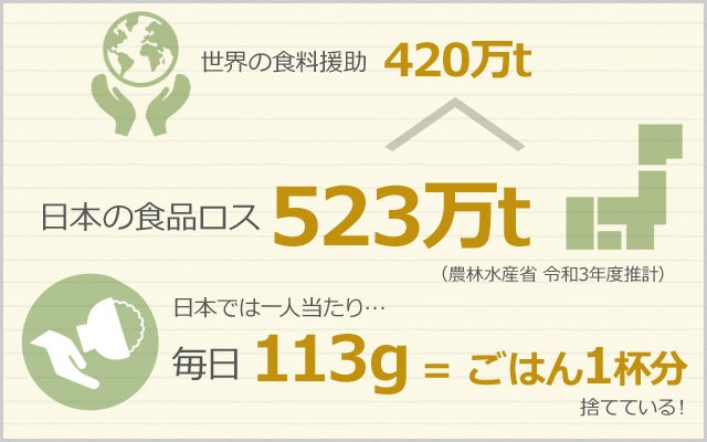 食品ロスは、食べ物や人の労働力、エネルギーを無駄にするだけでなく、環境にも悪影響を及ぼします。日本の食品ロス量は年間約523万トン(農林水産省及び環境省「令和3年度推計」)。国民一人当たり、毎日お茶碗一杯分のごはんを捨てている計算になります。また、日本の食品ロスは、飢餓に苦しむ人々への世界の食料援助量が約420万トンであるのに比べて、約1.3倍の数字となっています。