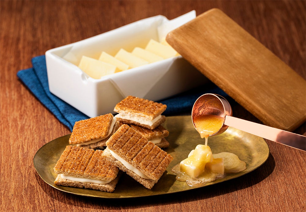 香り豊かなフランス産発酵バターを生地にじゅわっとしみこませ、香ばしくパリッと焦がし焼きしたサクサクの生地。まるで空に浮かぶ雲のようにもこもこなエアインショコラをサンドしてお作りしました。定番『シュガーバターサンドの木』と比べると、ショコラ量は1.3倍に増量!お口の中でとろけるミルキーなミルクショコラは、エアインで繊細な空気の泡を含むことにより、もっともっと“ふわとろ”に仕上げました。ひとくちかじれば、発酵バターの贅沢な香りと ショコラのミルキーな風味がお口いっぱい広がります。