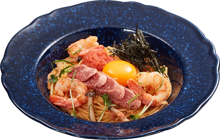 日本の秋の風物詩“月見”にぴったりな見た目の創作和風パスタです。牛肉、しめじ、長ねぎを加えた醤油ベースのパスタに、とろろ、卵黄をトッピングしました。濃厚な卵黄やのど越しの良いとろろが、甘辛い味わいの牛肉、和風のパスタと相性抜群です。お好みで別添えの野菜だしを注ぎ、味の変化をお楽しみください。