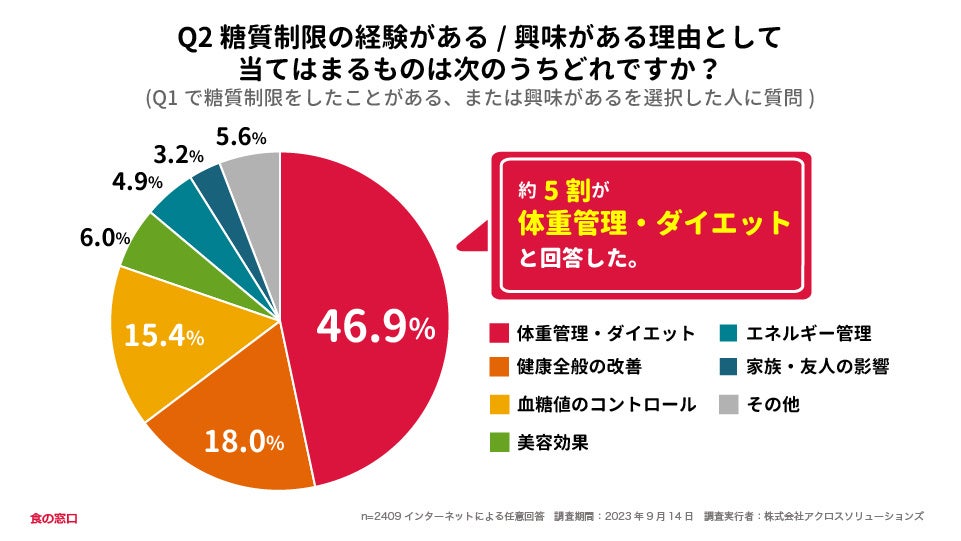 最も多い回答が「体重管理・ダイエット」で46.9%と、約半数の人が糖質制限をダイエット目的で経験/興味があると答えました。